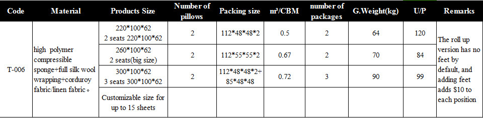 | Matériel | Éponge compressible à polymère haute densité + enveloppe en laine de soie + tissu velours côtelé/lin |